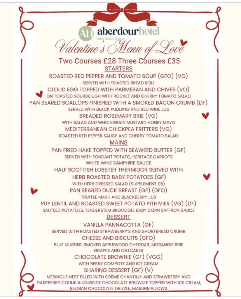 Join us at Aberdour Hotel from 13th–15th February and treat your special someone to our Valentine’s Menu of Love