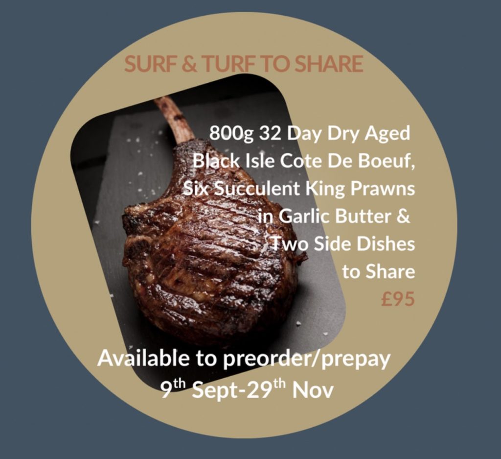 Surf & Turf Sharing Plate-800g (bone in weight) 32 Day Dry Aged Black Isle Cote De Boeuf with a pot of Six succulent King Prawns in Garlic Butter & Two Side Dishes of your choice.