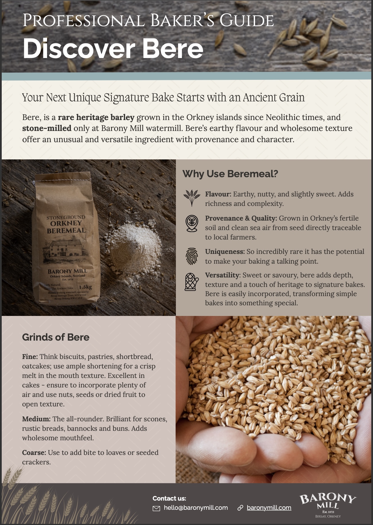 Beremeal is flour made from Bere, an old variety of six-row barley described as having an earthy, slightly astringent, nutty flavour. Traditionally used to make a bannock, a specialty of Orkney, Shetland and the Western Isles. Beremeal was widely used throughout Scotland where barley bannocks were eaten as the main bread. Hand mills or querns produced Beremeal for household purposes while watermills produced meal on a larger scale. It is also available as bere flakes & bere berries
